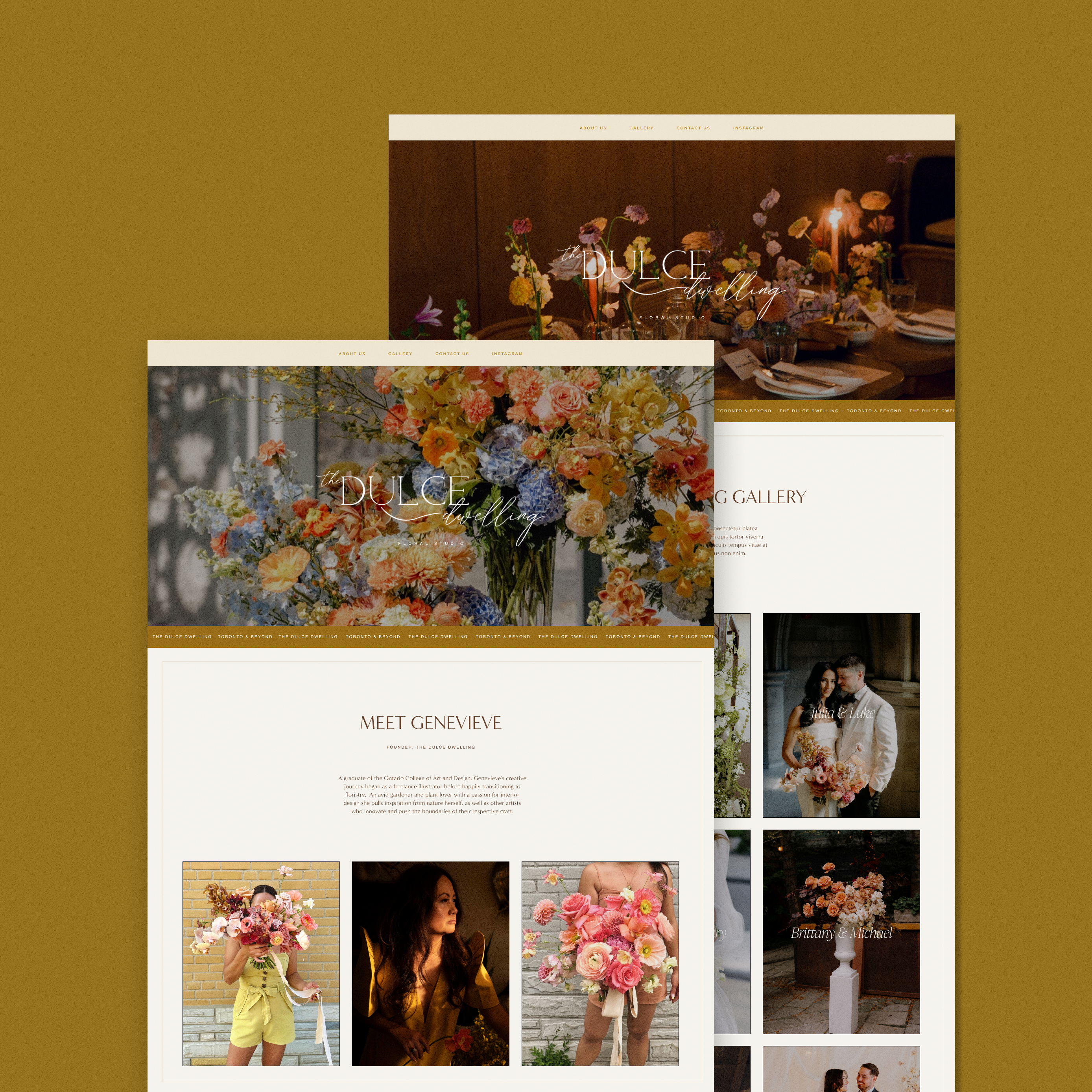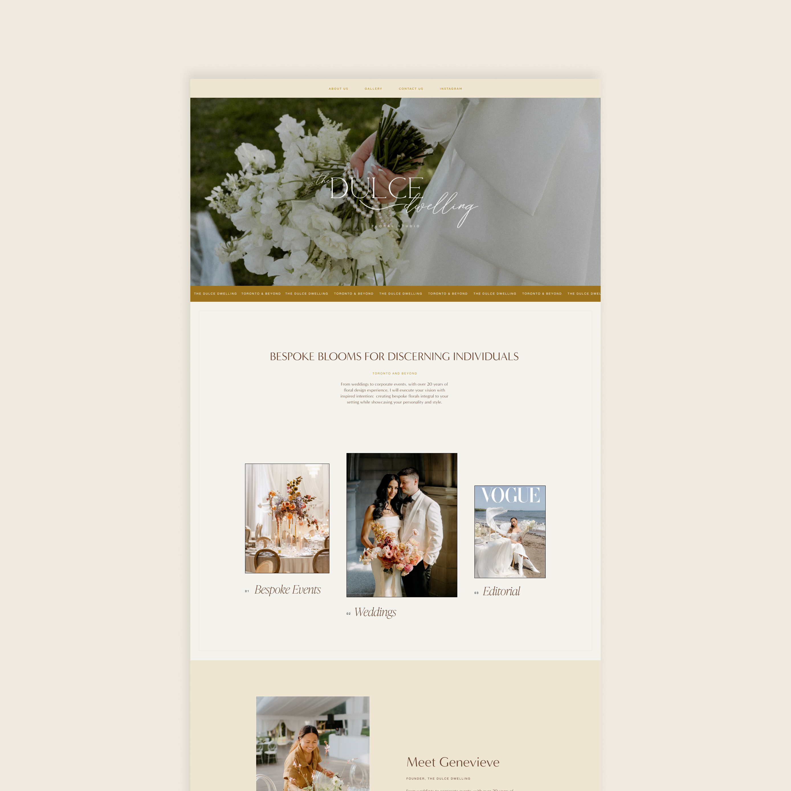The Dulce Dwelling is a premium bespoke wedding floral studio from Ontario, dedicated to bringing whimsical, ethereal wedding florals to its clients. Genevieve wanted her website to incorporate the rustic gold trim of her brand, and it went beautifully with how we connected her brand vision to her new website.